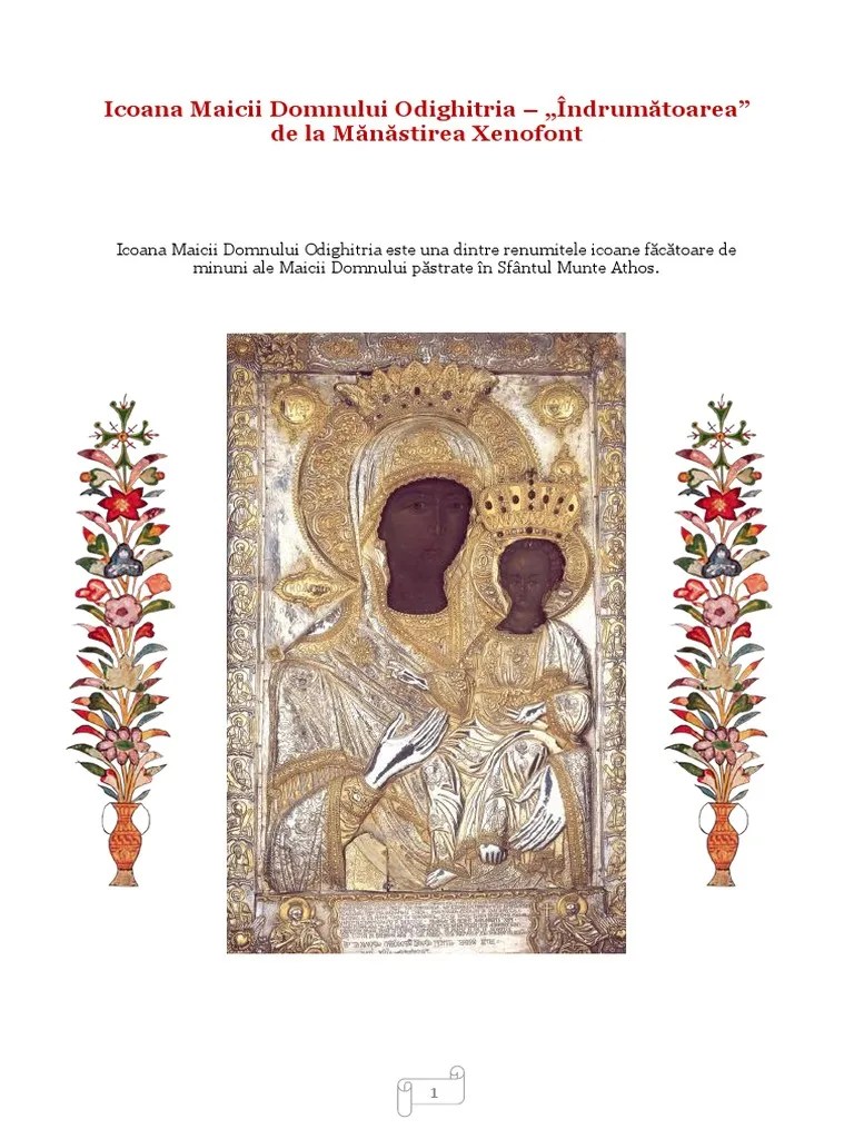 Această icoană a preasfintei născătoare de dumnezeu mai este cunoscută și ….. Pruncul iisus ţine în mână un sul de hârtie, …. Icoana maicii domnului odighitria este una dintre renumitele icoane făcătoare de minuni ale maicii domnului păstrate în sfântul munte athos.
